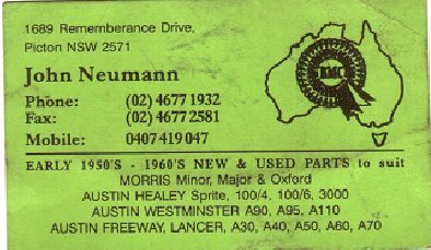 "Can't help you there mate" How many times do you hear it? Parts are hard to come by, especially if what you need is not used on another BMC car. Some new old stock items regularly appear on Ebay, and there are some commercial suppliers with some stock. If you have parts to sell, consider helping out other owners. Don't dump them, advertise them. You may be surprised as to what they're worth.